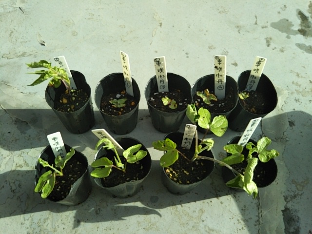 こんにちは。部外者ですがまたどうか投稿お許しください。m(._.)m変化朝顔研究会さんからお譲り頂いた九年前の朝顔、青葉覆輪車咲牡丹の出物について質問です。どれが出物か教えて頂けないでしょうか。あさがおの先生方どうぞ宜しくお願い致します。現在5つ発芽しています。