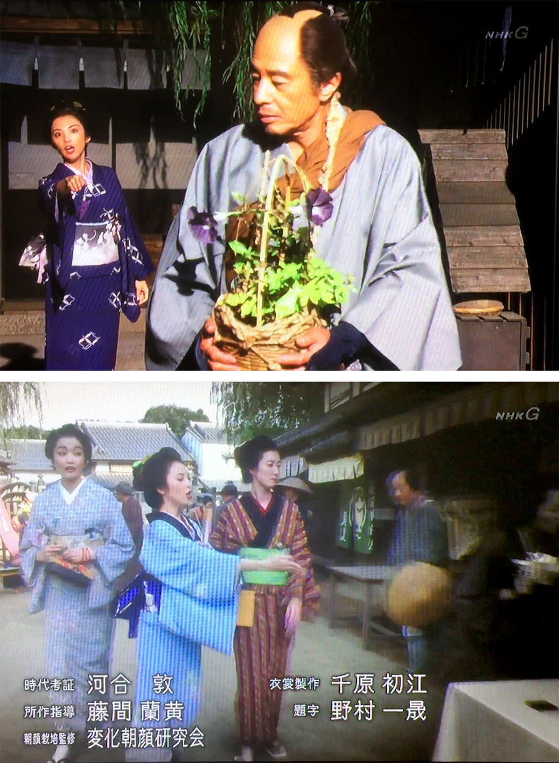 島田宿の小間物屋の主(舘ひろし)は、自分で作出した黒い朝顔を出がけに名を『隅田川』と名付け、江戸の花競べに出そうと鉢を手に出発する。
