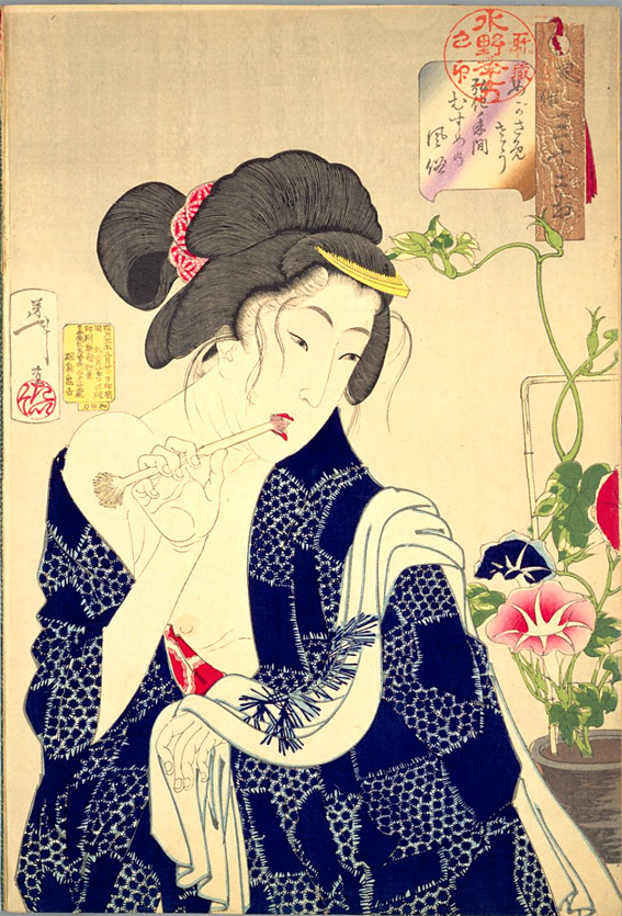 午前中に咲いて、午後にはしぼんでしまう朝顔と、朝の身支度をする女性を取り合わせた浮世絵は、数多い。江戸時代の園芸師を研究する台東区立中央図書館専門員の平野恵氏によれば、当時から、たびたび栽培ブームが起こった朝顔は、女性の暮らしの一コマを彩るのに、格好の題材だったようだ。
